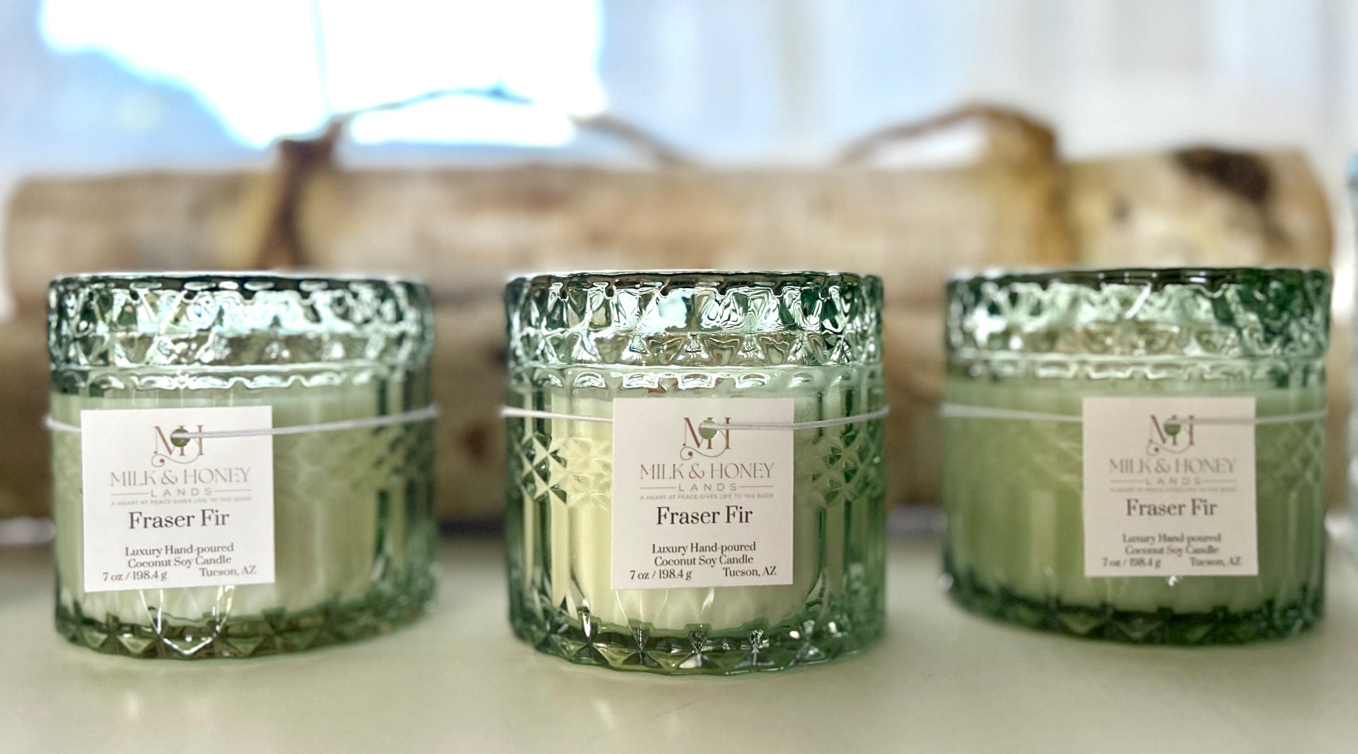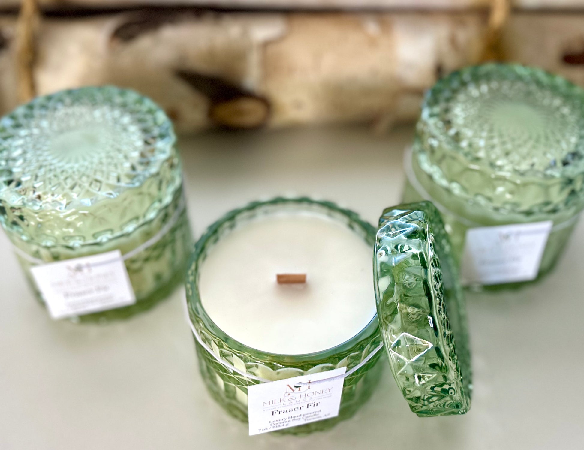 Fraser Fir captures the essence of a freshly-cut Christmas tree with top notes of cypress and lemon, woodsy mid notes of evergreen and cedar, and a rich base of fir, amber, and moss. Hand-poured from 100% natural coconut soy wax infused with essential oils, this 7 oz candle burns clean for up to 28 hours. The reusable vintage green glass vessel is free from phthalates and synthetic fragrances, making it an eco-conscious choice for creating a festive or cozy winter ambience.