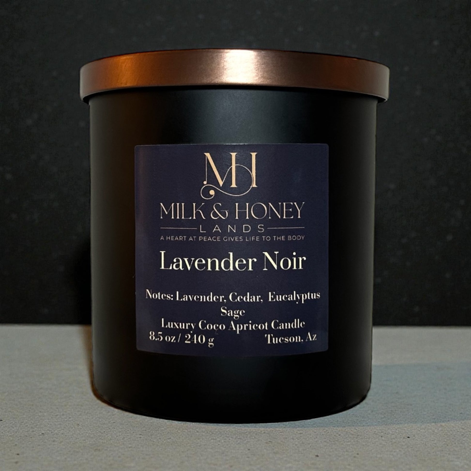 Lavender Noir, when blended with Coco Apricot wax, delivers a soothing yet sophisticated fragrance. The Lavender Noir scent artfully balances the herbaceous, calming aroma of fresh lavender with the warm, woodsy essence of cedar. This harmonious blend provides a relaxing and tranquil atmosphere, perfect for unwinding after a long day. The Coco Apricot wax enhances the fragrance profile with a smooth, creamy base that ensures a clean, even burn. Lavender Noir features CleanScent technology and clean-burning wood wicks for a premium, eco-conscious candle experience. Each candle is hand-poured, offering an artisanal and personal touch.